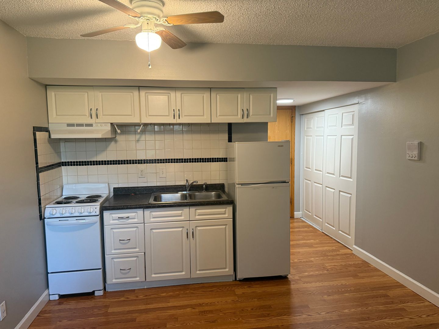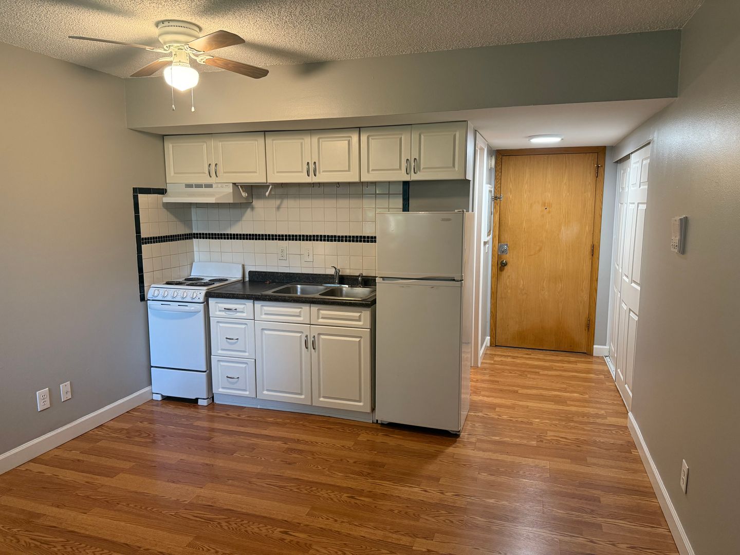 Updated kitchen with new, vinyl plank flooring throughout. Kitchen includes wood-finished 30-inch cabinets, refrigerator, and 20 inch electric stove. Ample closet space.