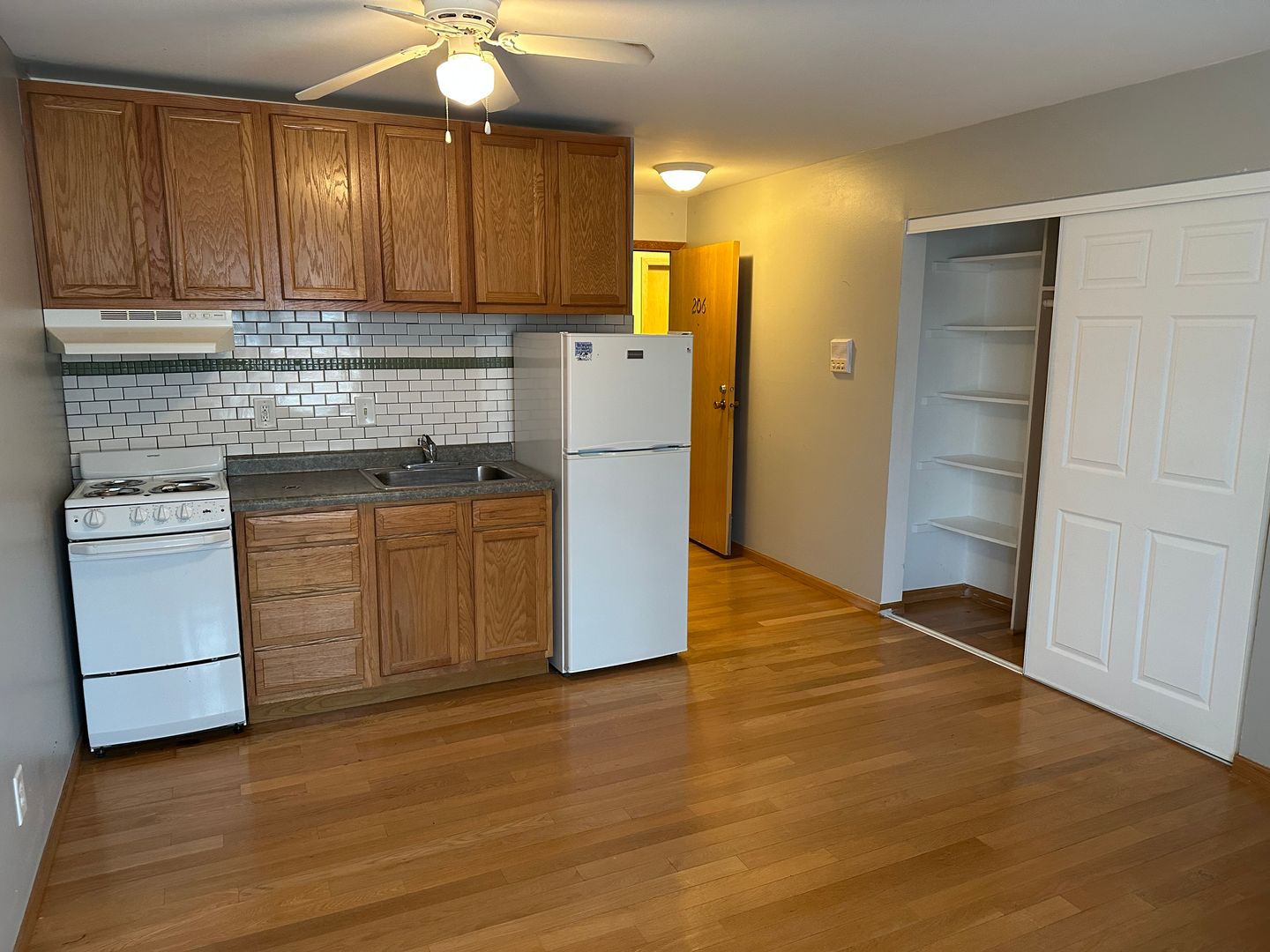 Updated kitchen and vinyl plank flooring throughout the unit. Kitchen includes wood-finished 30-inch cabinets, refrigerator, and 20 inch electric stove. Ample closet space.