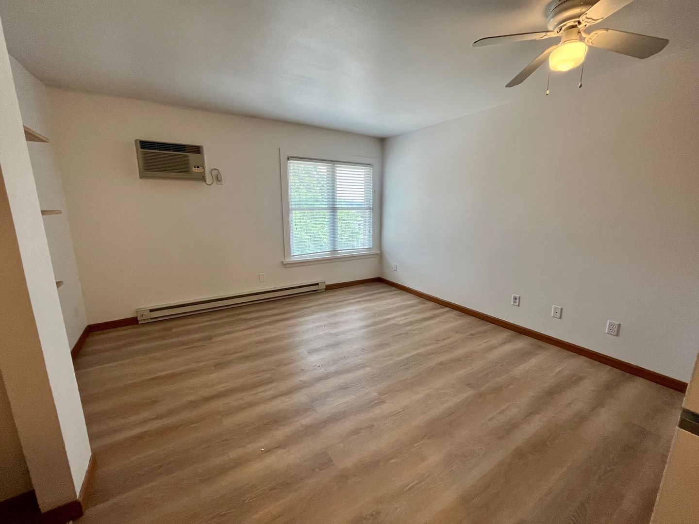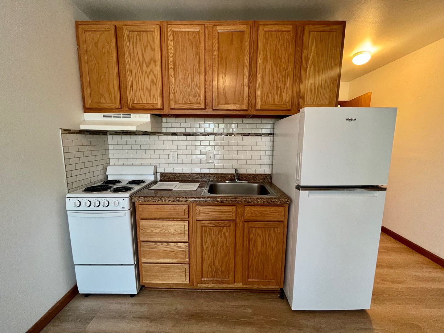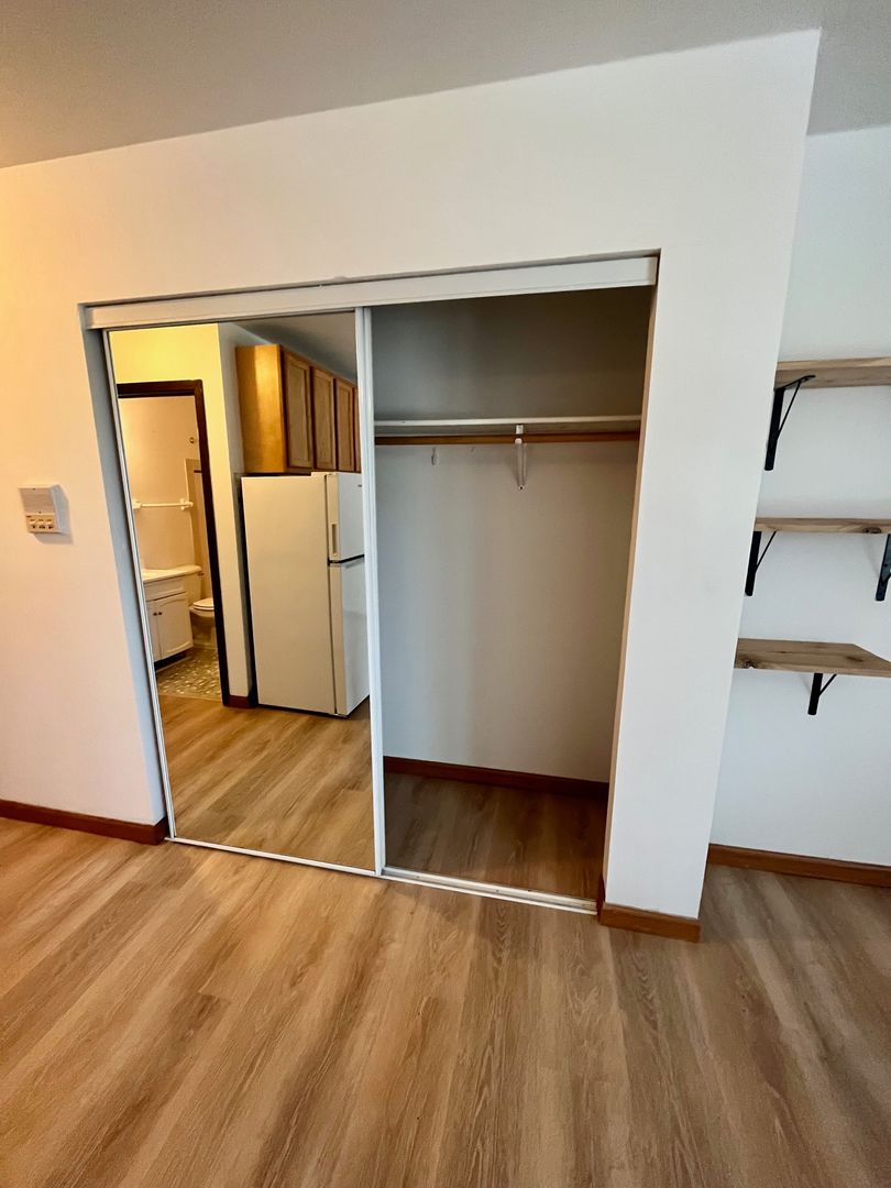 Updated kitchen and vinyl plank flooring throughout the unit. Kitchen includes wood-finished 30-inch cabinets, refrigerator, and 20 inch electric stove. Ample closet space.