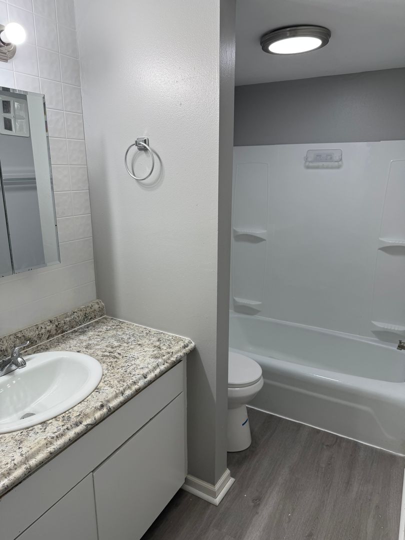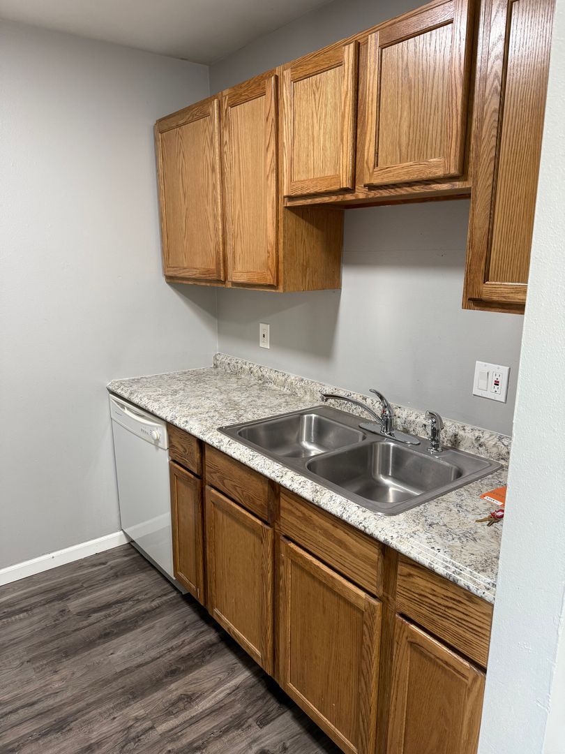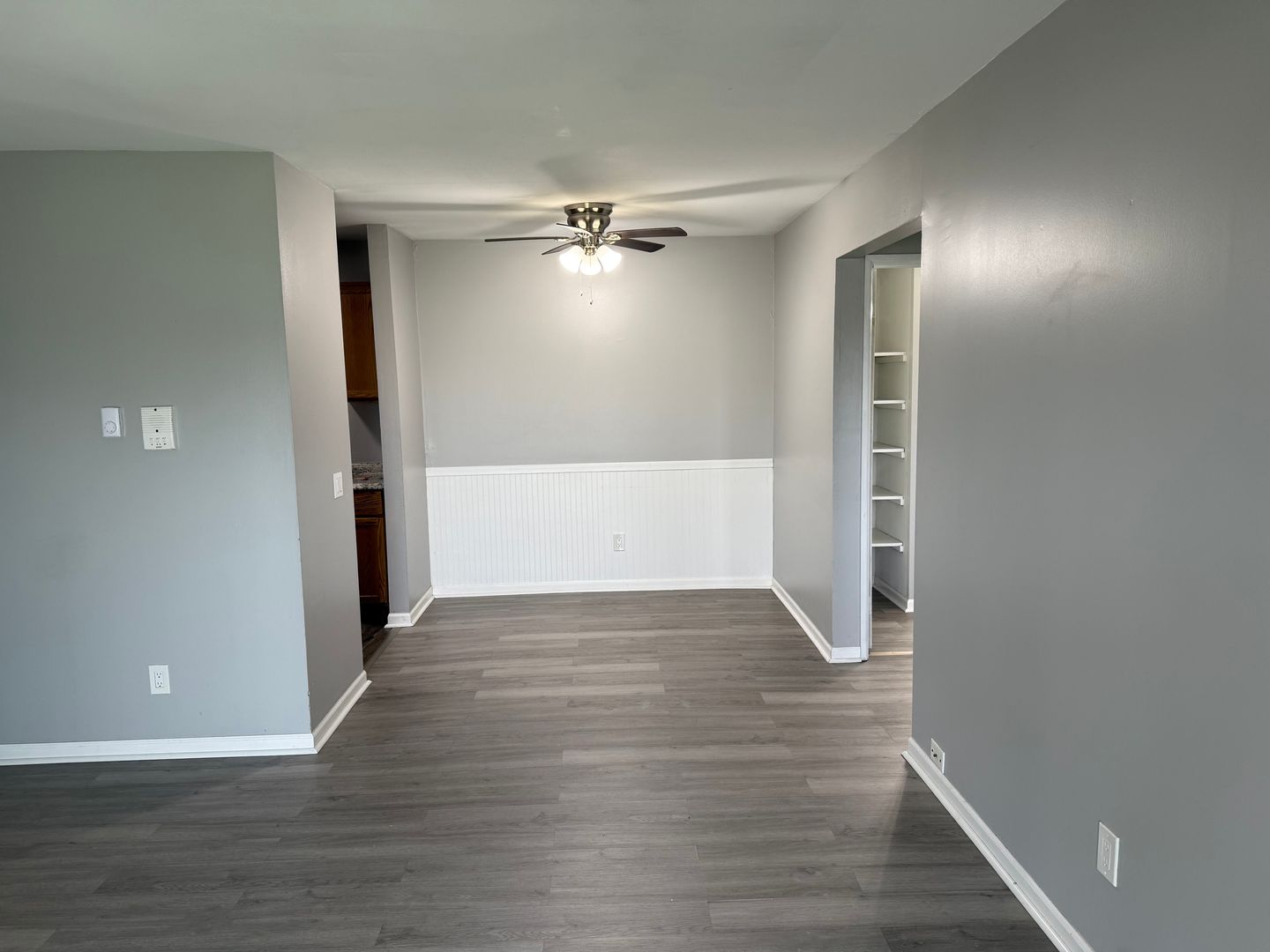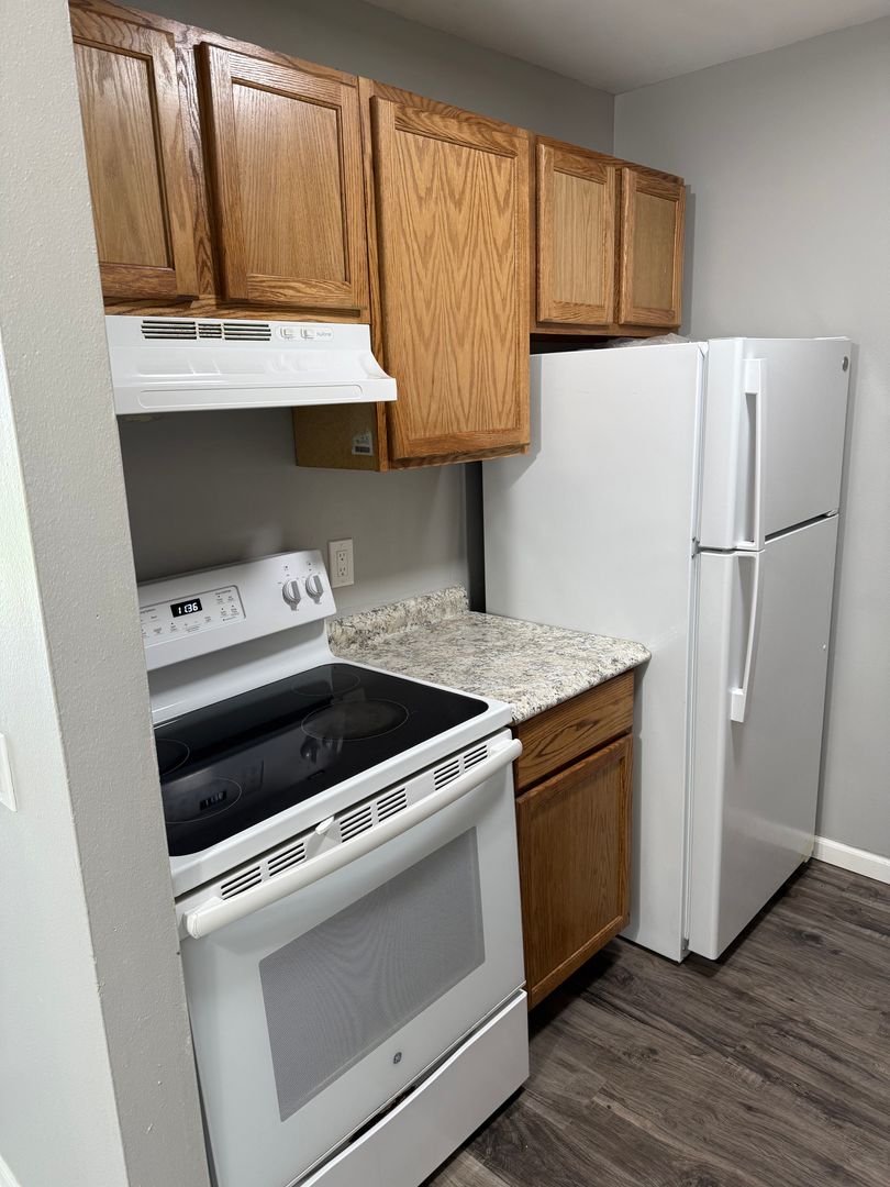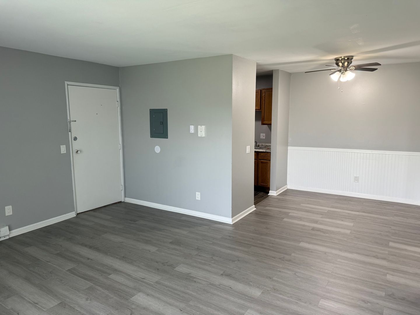Modern kitchen finishes include 42-inch cabinets, wood vinyl floor, ceiling fan in the dining room and a full set of appliances including refrigerator, dishwasher and oven. Ceiling fan in the dining room. Large living room has vinyl floor and access to a private exterior balcony.