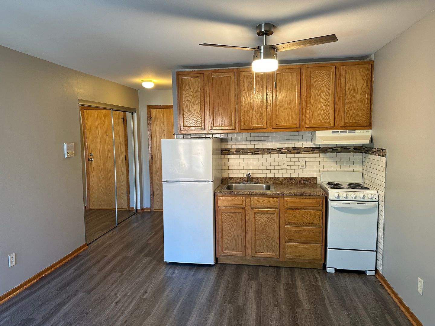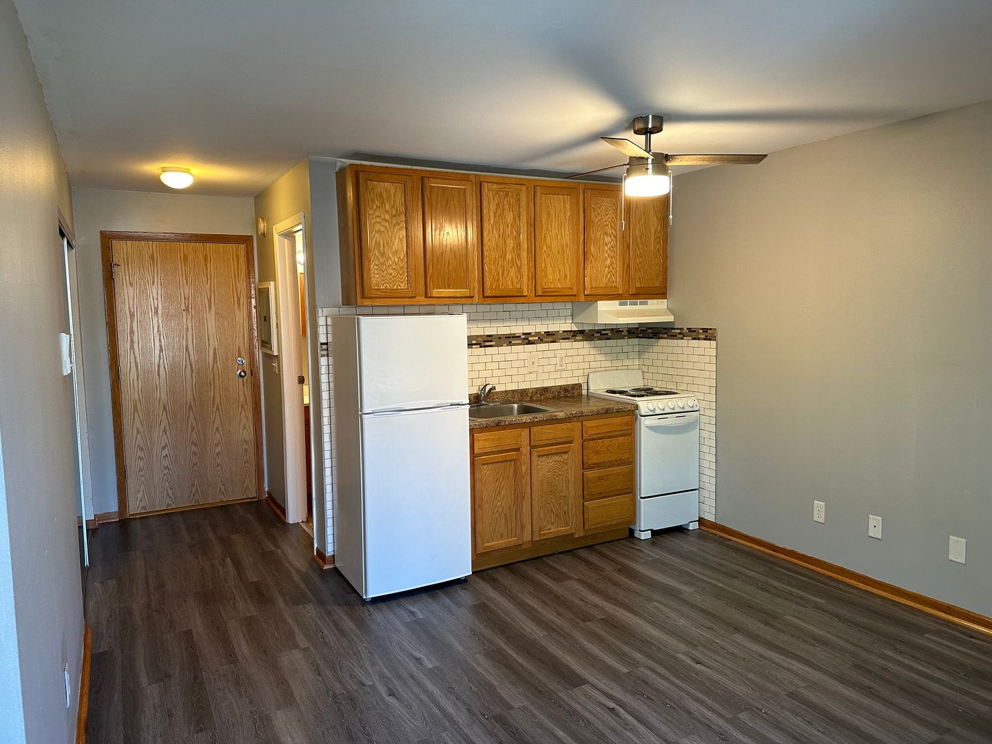 Updated kitchen with new, vinyl plank flooring throughout. Kitchen includes wood-finished 30-inch cabinets, refrigerator, and 20 inch electric stove. Ample closet space.
